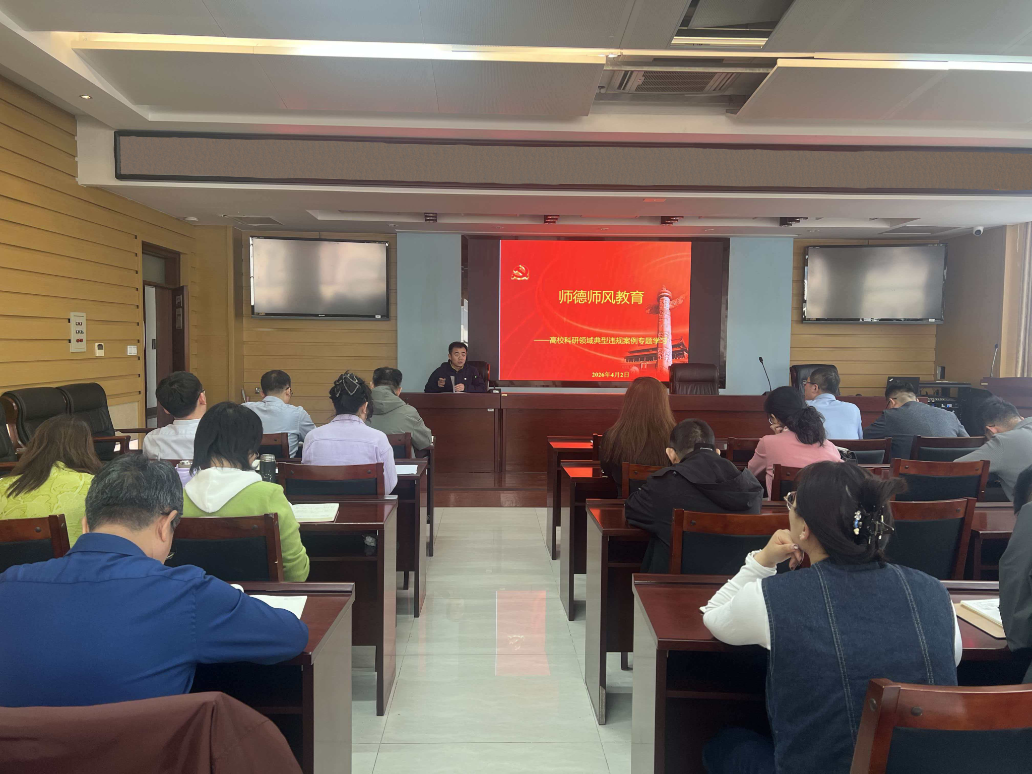 本次重点学习了《高校科研领域典型违规案例》,通过深入剖析案件成因与严重后果,引导全体教师以案为鉴、警钟长鸣,深刻认识科研诚信与师德规范的重要意义。会议由学院副院长柴轶凡组织,学院全体教师参加。